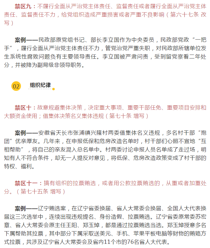 为强化对《中国共产党纪律处分条例》的学习,学先一步,学深一层,学用结合,集团纪委引用中央纪委国家监委网站的内容,带领大家从“典型案例”中深刻领会《条例》修订的重大意义,积极用《条例》武装头脑、筑牢防线,进一步增强纪律意识、规矩意识。下面,就让我们通过案例看一看这些不能触碰的禁区!